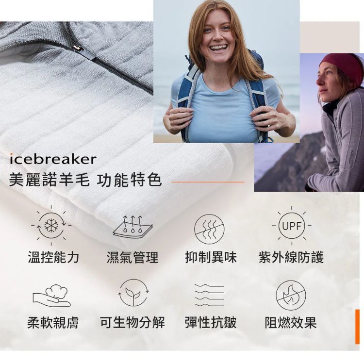 icebreaker 美麗諾羊毛的八大優點:溫控能力 、濕氣管理、抑制異味 、紫外線防護 、可生物分解 、彈性抗皺 、阻燃效果