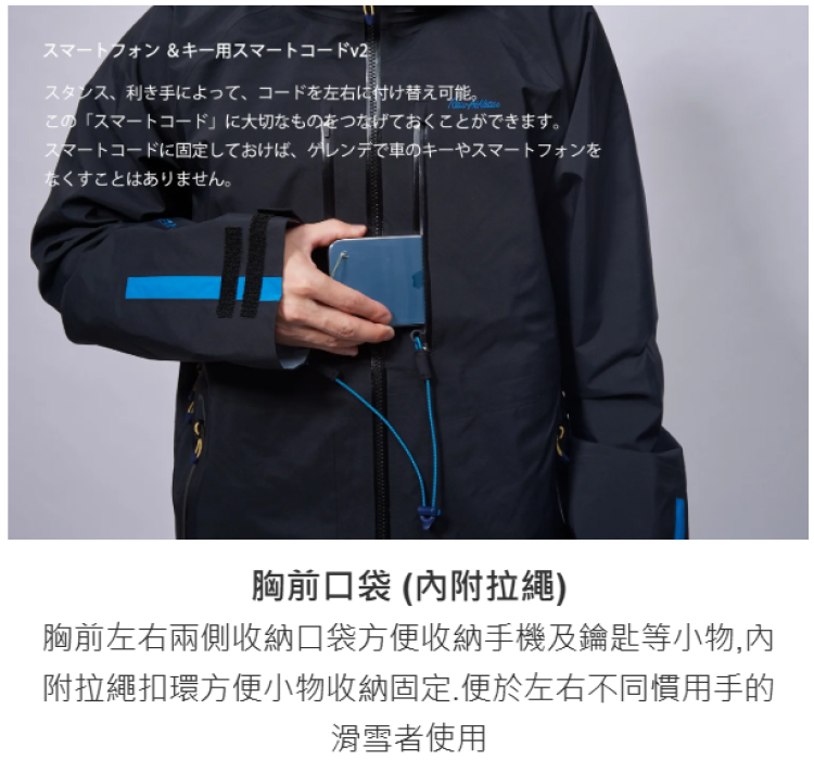 - 胸前口袋 (內附拉繩)