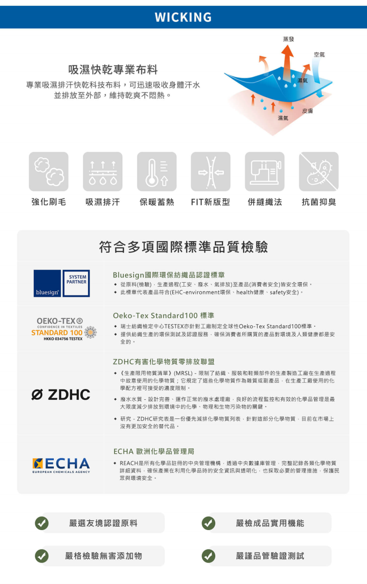 -【吸濕排汗】能迅速將汗水排出,保持乾爽不悶熱