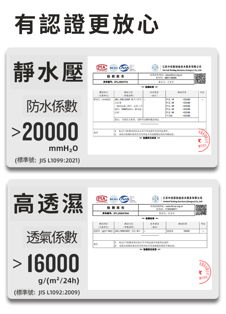 - 防水係數>20000mmH₂O